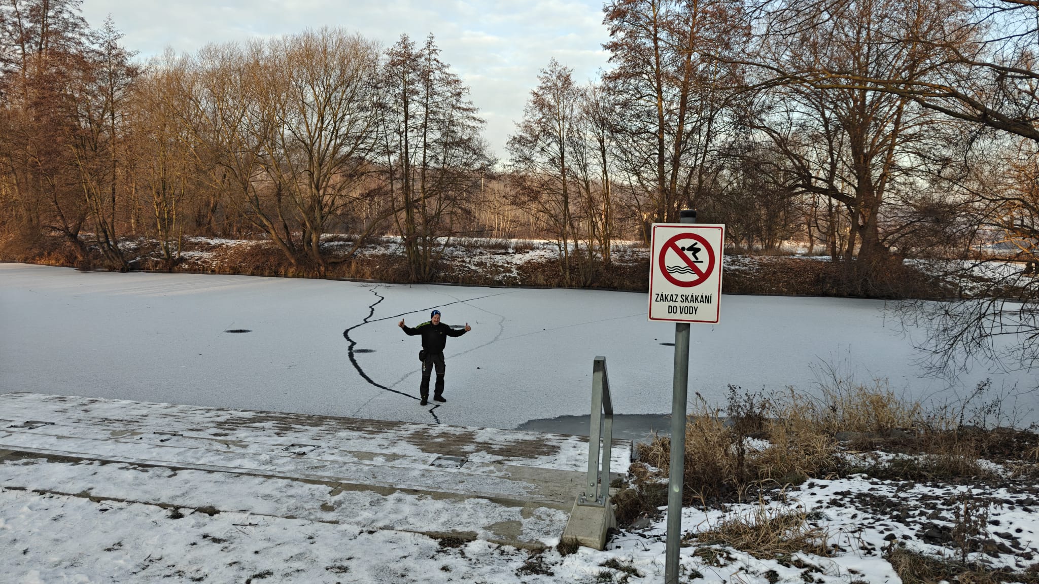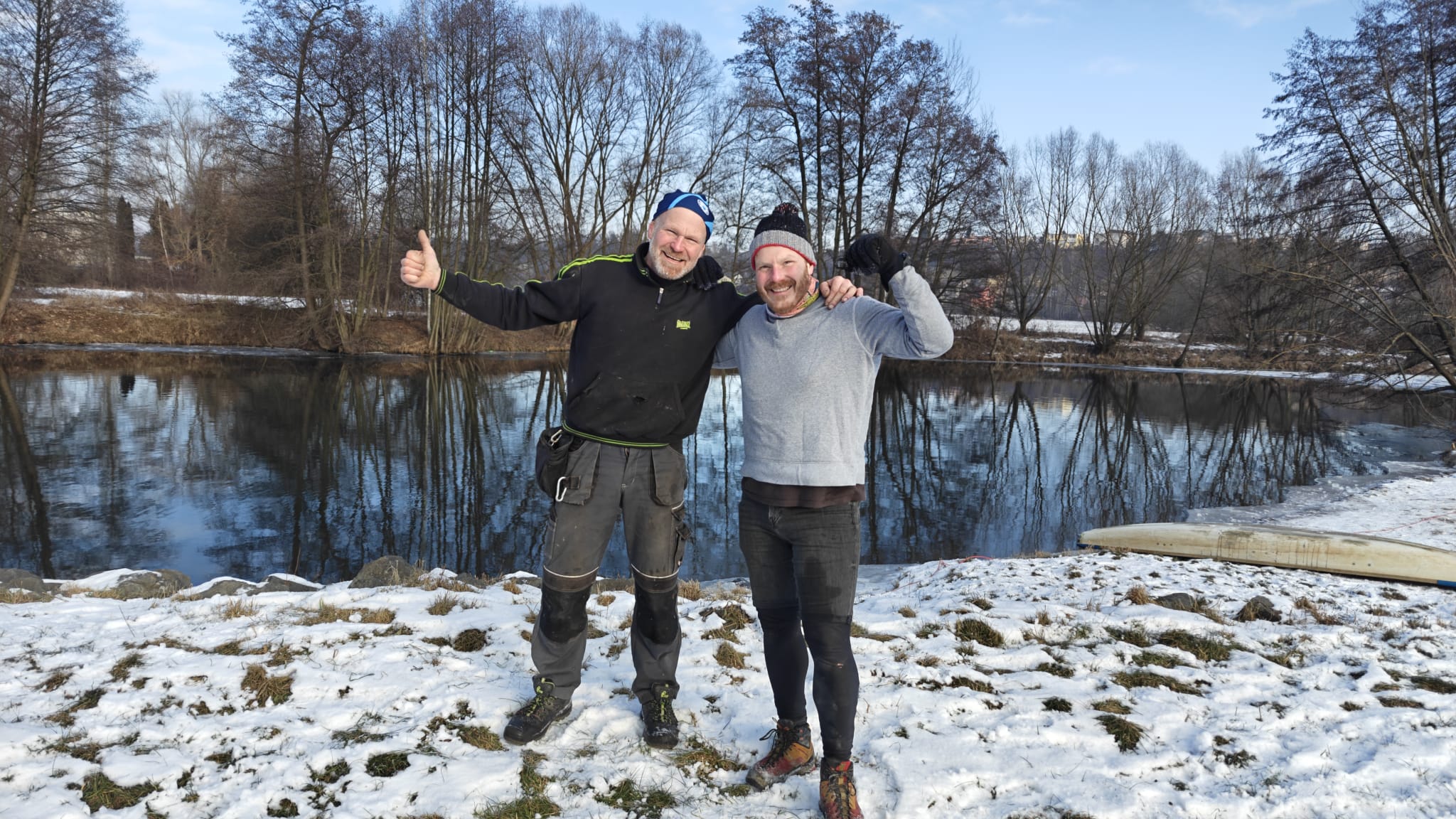 posílám aktuální informace z Mladé Boleslavi. V noci na čtvrtek byla při vyjasnění teplota vzduchu mínus 11 stupňů. Voda stále okolo nuly. Jezdíme několikrát denně a jednou v noci a daří se nám držet 150 m úsek v oblasti plážičky, kde býval start 750. Na startu 1000 m jsem se dnes procházel po ledu. Jizera jinak kompletně zamrzlá. Věřím že napadne pouze 5 cm sněhu. zatím tedy souboj s přírodou dáváme, takže stále platí že bude připraven úzký kosodélník se čtyřmi bojemi, o délce 250 m. Bude samozřejmě krácen protože jsou tam otočky. Plavat se bude po levé ruce. Proud je minimální, odhaduju povrchově 2m za minutu. Ledy, nebo spíše už jenom slabá tříšť po rozbití odplouvají nemusíte se bát. Dva velké teplé stany úplně ohřáté, na podlaze bude centimetrový filc a s obsluhou, která bude hlídat že na místě a zajišťovat tak tepelný komfort i přísun teplého čaje na místě u stanu.